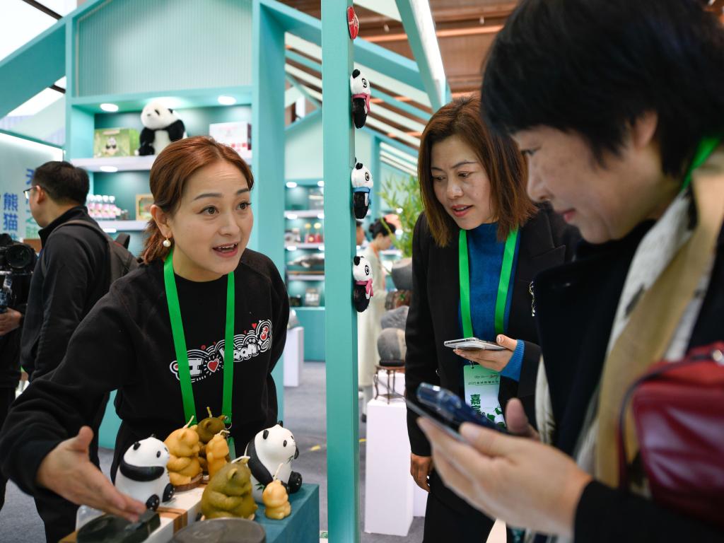 11月21日,在熊猫文创集市上,来自四川雅安的参展商为嘉宾介绍由大熊猫粪便制作的熊猫造型香薰蜡烛。新华社记者 胥冰洁 摄