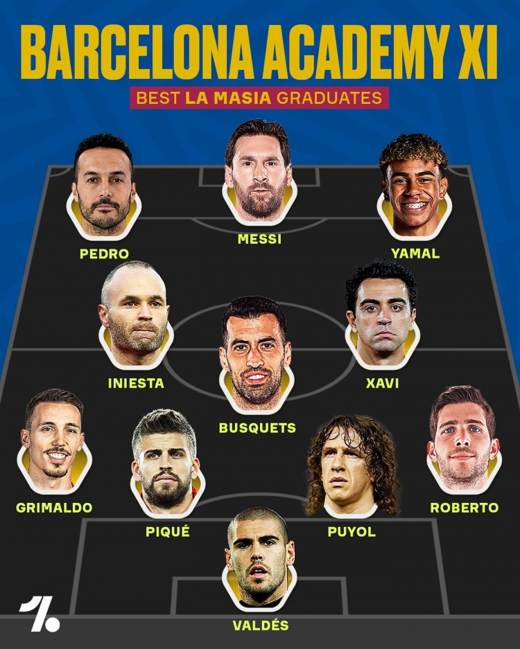 直播吧9月26日讯 Onefootball列出了由拉玛西亚青训球员组成的阵容,梅西、哈维、伊涅斯塔、亚马尔在列。